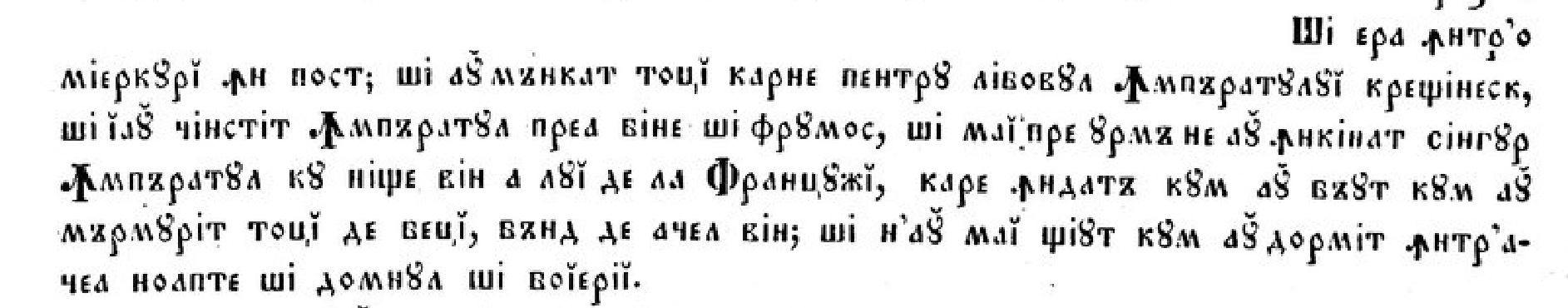 Și era într’o Miercurĭ, în postŭ; și aŭ măncatŭ toțĭ carne pentru libovul Împĕratuluĭ creștinescŭ, și ĭ-aŭ cinstitŭ Împĕratulŭ prea bine și frumosŭ, și maĭ pre urmă ne aŭ închinatŭ singurŭ Împĕratulŭ cu nisce vinŭ a luĭ de la Françujĭ, care îndată cum aŭ bĕutŭ cum aŭ mărmuritŭ toțĭ de bețĭ, bândŭ de acelŭ vinŭ; și n’aŭ maĭ sciutŭ cum aŭ dormitŭ într’acea nópte și Domnulŭ și boĭeriĭ.[6]